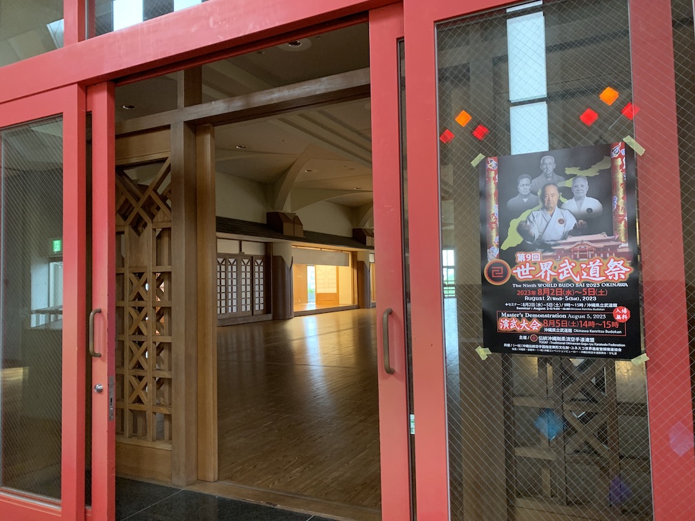 This meant I arrived in Okinawa earlier on the Monday than planned, but still too late to register for Budosai as the the typhoon was near and the Japanese government was already posting safety alerts and restricting movements. Tuesday’s registration was cancelled and no training on Wednesday as typhoon Khanun passed by the south of the island. Thursday was a busy day at the Budokan – early registration and longer day of training to catch-up on what was missed from the previous day. As we had more sessions this meant that I got to train with Higoanna Sensei twice in one day. Both times I had a chance and honour to speak to Higoanna Sensei. I spoke about my background in Shotokan and we reminisced about Kanazawa Sensei and the early days of Karate.